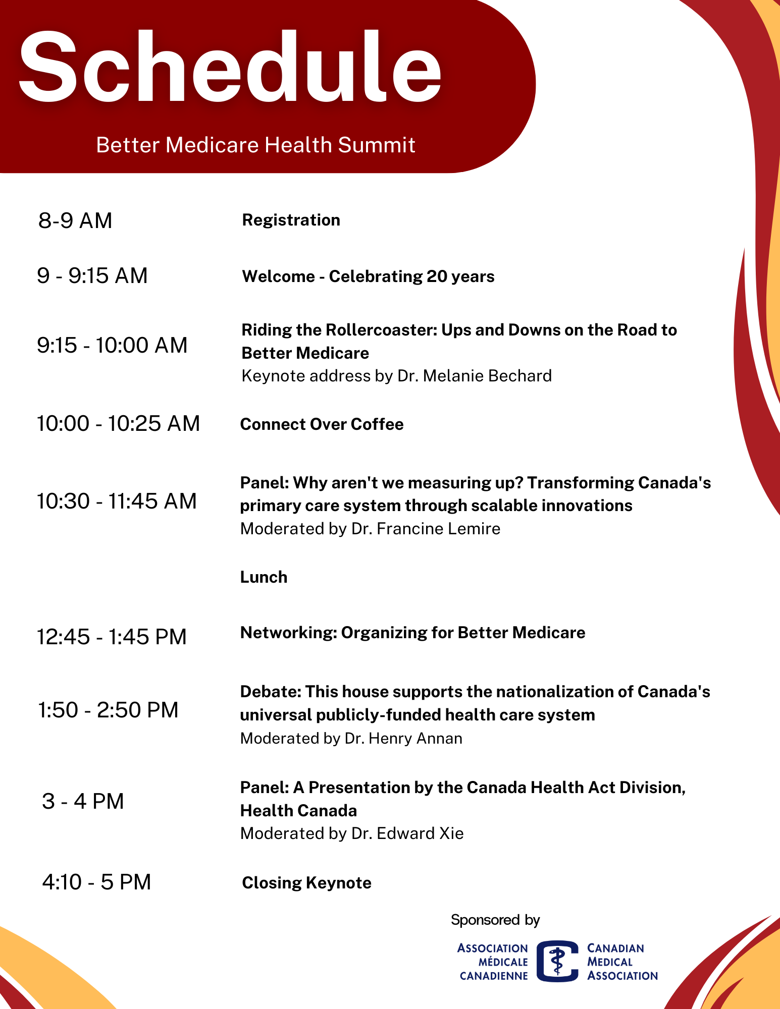 At the Better Medicare Health Summit, we will explore the future of Medicare in Canada, scalable solutions to transform primary care, the growing risks posed by for-profit care and the private insurance industry, public solutions to address health care wait times, the importance of enforcing the Canada Health Act, and much more.